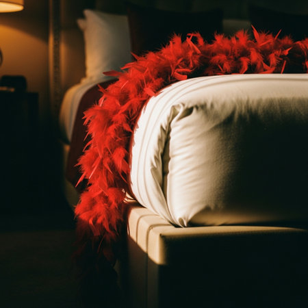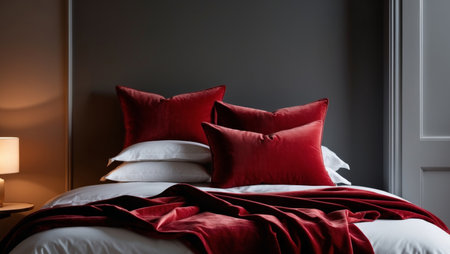 AI Generated. Soft red velvet pillows and blankets elegantly draped on a cozy bed in a dimly lit bedroom during the evening