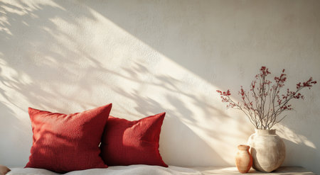 Red pillows rest on a soft surface, while sunlight casts gentle shadows on a textured wall. Simple ceramic vases and dried flowers create a calming, inviting space.