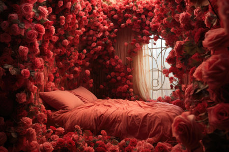 Interior of a bedroom decorated with red roses and a bed.