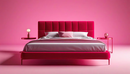 red upholstered bed with white blankets, a 3d model that showcases realistic and detailed rendering. the minimalist background in pink and white adds a touch of elegance to this pop-culture-infused design. with its texture-rich appearance, this bed captures the essence of the 1970s to the present day. ai generated