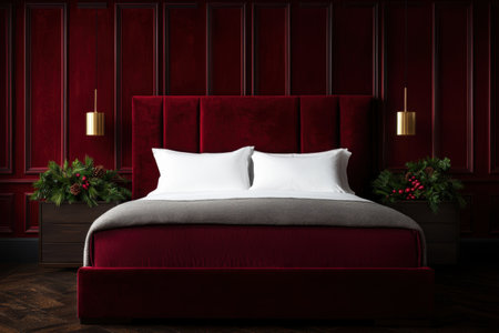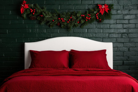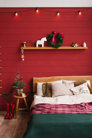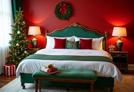 Elegant Christmas bedroom decorated with tree, wreath and festive accents in red and green. Cozy holiday atmosphere perfect for winter celebration and seasonal lifestyle
