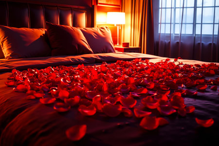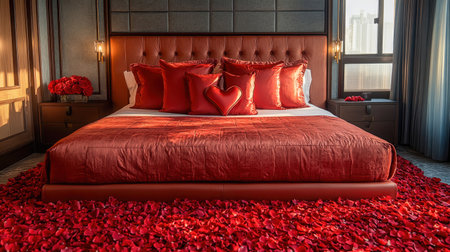 A luxurious romantic bedroom with a bold red heart centerpiece, velvet bedding, scattered rose petals, and warm wooden accents. Large windows and lush greenery add elegance and charm.