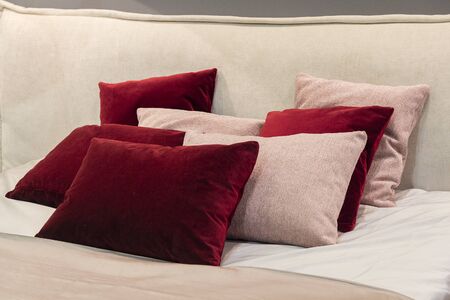 modern bedroom style with set of pillows on bed, interior design concept decoration