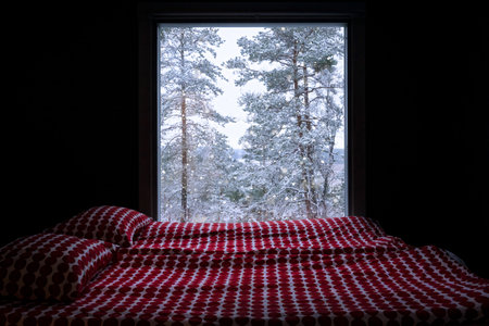 A bedroom with a large window overlooking a beautiful winter landscape.