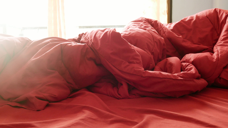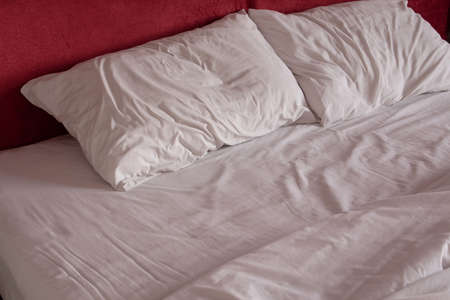 Rumpled red pillow lays on an unmade bed with white sheets in the morning light