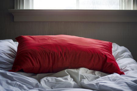 bed with two pillows on a red wall, featuring a light crimson and pink color scheme. the photo showcases hyper-detail and a minimalist background, with a subdued color palette. the water depicted is hyper-realistic, adding a touch of humor to the overall tone. the selective focus draws attention to the bed and pillows. ai generated