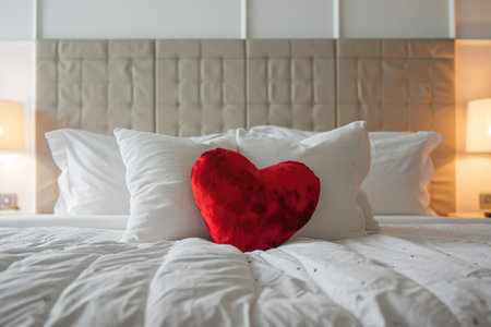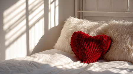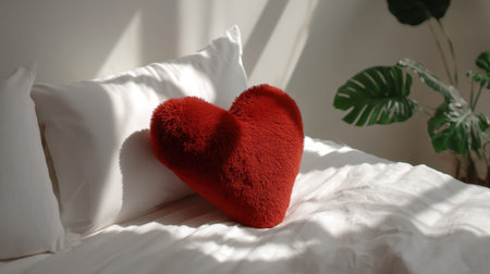 A serene bedroom scene featuring a heart-shaped red pillow resting on a soft, fluffy white bedding. Gentle natural light and shadows create a tranquil ambiance.