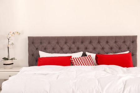 Double bed with bright pillows in the room. interior design elements