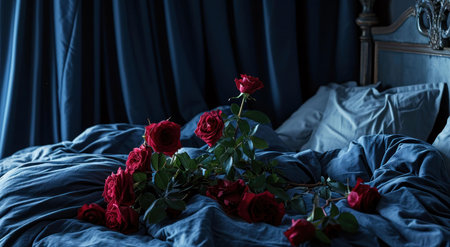A bouquet of red roses rests on a luxurious blue velvet bed, creating a romantic and serene atmosphere.