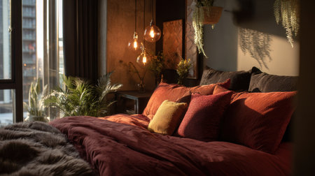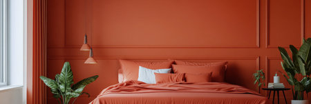 This inviting bedroom features a warm orange color scheme with a cozy bed adorned with plush pillows. Stylish pendant lights hang above, while lush plants add a touch of nature to the space.