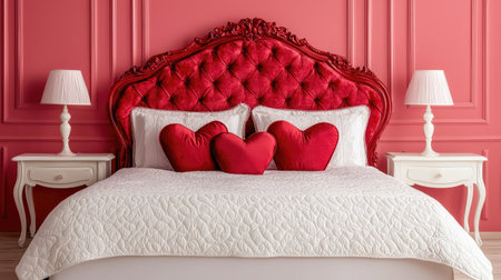 A romantic bedroom featuring a red tufted headboard, white bedding, and heart-shaped pillows against a pink wall.
