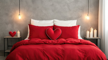 A cozy bedroom with red accents, featuring a heart-shaped pillow, candles, and a modern aesthetic, perfect for romantic settings.