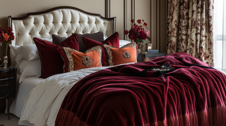 A luxurious bed with a tufted headboard, draped in rich, velvet blankets and accent pillows, set in an elegantly decorated bedroom.