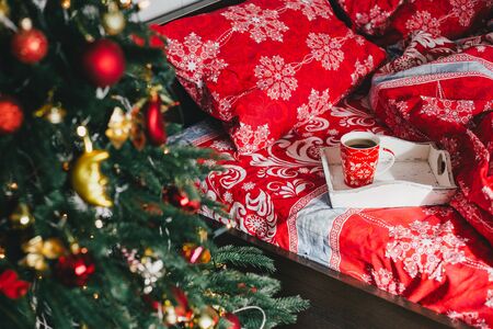 Interior with Christmas tree in a cozy bedroom. Holiday morning