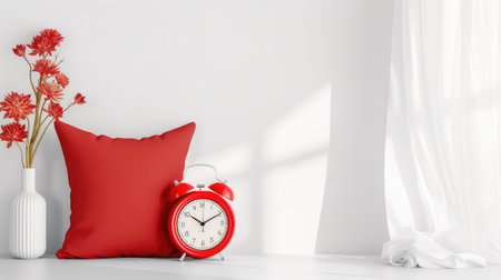 A serene and cozy interior showcasing a red pillow and a vintage alarm clock by a vase with flowers, bathed in soft sunlight, perfect for home decor inspiration.