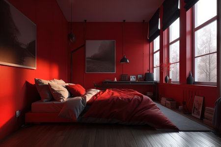Red bedroom interior with red walls, a comfortable bed with red pillows and a vase with flowers. generative ai
