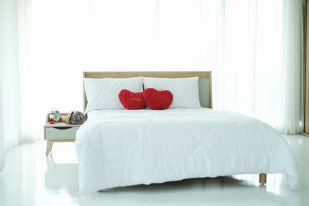 Red heart shaped pillow lies on the bed in a cozy bedroom. The pillow is soft and fluffy