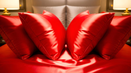 Red pillows are arranged on a smooth bed covering in a bedroom. Soft light from lamps adds warmth to the space, creating a welcoming environment for the rest.