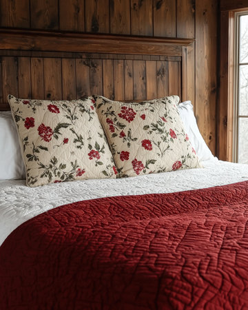 Cozy bedroom with floral pillows and red quilt.