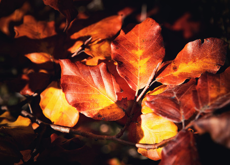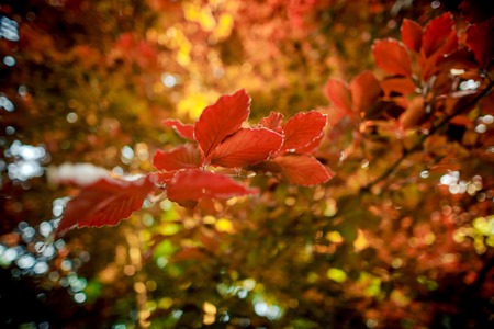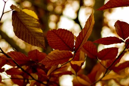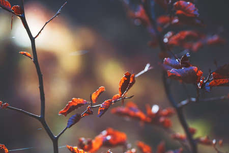 Autumn nature. Close up of branch with colored leaves in autumn with sun rays.