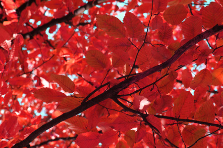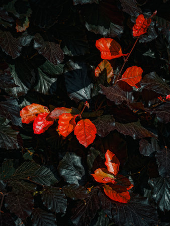 Autumn beech foliage in Sunlight shows leaves turning vivid red color contrasting with the dark green foliage of the hedge.