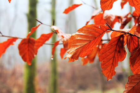 Close-up of thin branches with vivid orange autumn leaves. The background is softly blurred, suggesting a misty forest in the fall season.