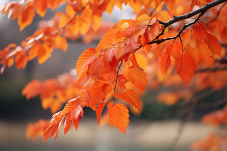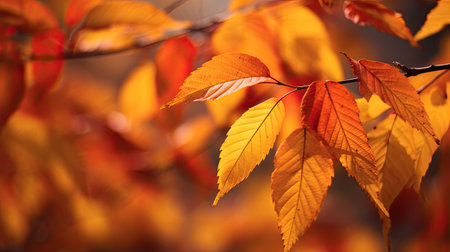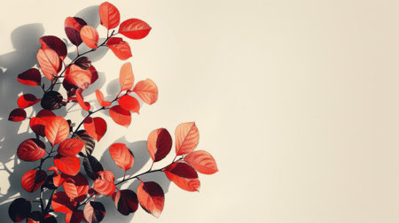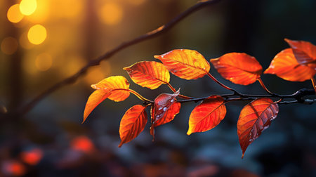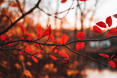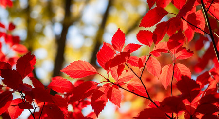Generative AI : Autumn red tree branch with leaves natural fall vivid sunny background
