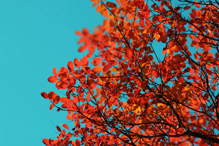Red colorful autumnal leaves, blue sky background. autumn concept