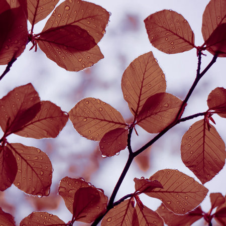 A close-up captures many vibrant purple beech leaves intertwined with branches, creating a rich, textured pattern in natural sunlight during the Autumn.