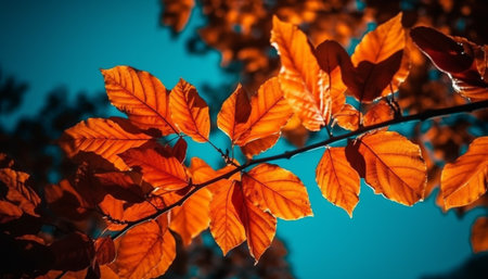 Vibrant autumn colors on a maple tree branch, backlit by sunlight generated by artificial intelligence