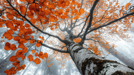A stunning scene showcasing a majestic tree with vibrant orange leaves rising amidst a misty forest. The enchanting atmosphere captures the essence of autumn, inviting nature enthusiasts to explore its beauty.