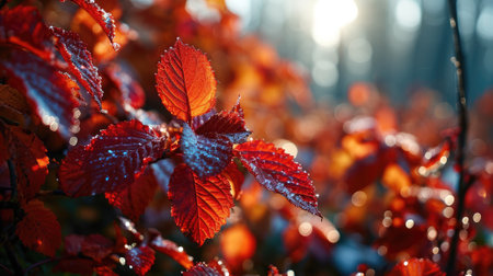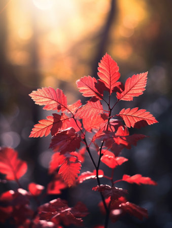 Close-up of radiant red autumn leaves backlit by the warm glow of sunlight