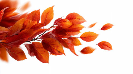 A branch with autumn leaves isolated on a white background, showcasing the vibrant colors of the changing season. The leaves are a mix of orange and brown hues, with some still clinging to the branch while others have begun to fall.