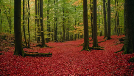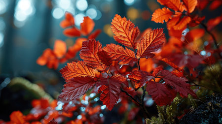 A captivating scene of vibrant red autumn leaves ablaze against a backdrop of sunlit woodland Dramatic backlighting illuminates the foliage, creating a stunning display of fall color Perfect for nature and autumn-themed projects AI Generative