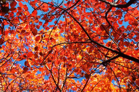 Golden young beech tree against clear blue sky on a sunny day. Close-up of colorful red, orange, yellow leaves. Natural pattern, texture, background. Early autumn. Seasons, climate change, environment