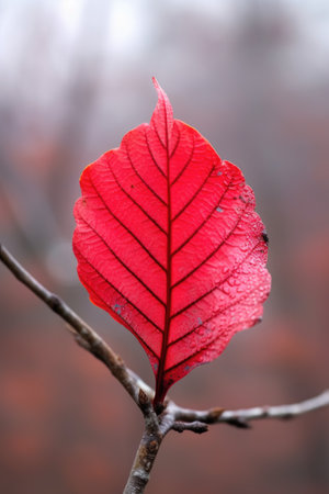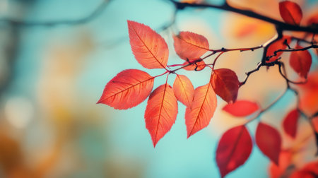 Autumn leaves against a soft, blurred background. Close-up of vibrant red autumn leaves on a branch, a soft, blurred background. The leaves' delicate veins are visible. Fall season, October, November.