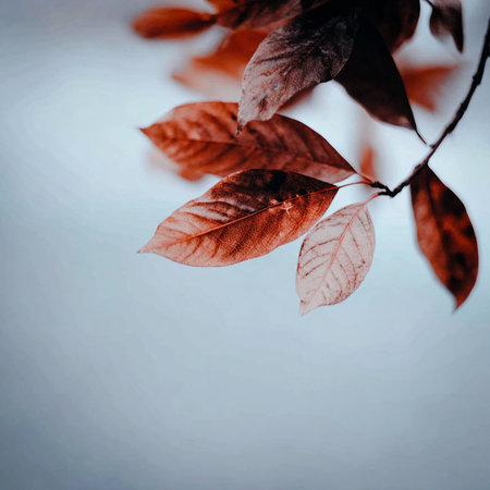 Bare branches reaching out with colorful fall leaves clinging delicately, serene seasonal mood