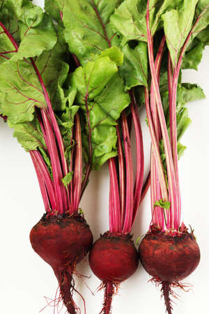 Bunch of fresh raw organic beets with leaves isolated on white background.