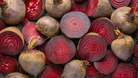 Detailed macro shot of fresh, vibrant red beet slices, highlighting the smooth texture and circular patterns of the vegetable.
