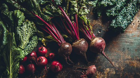 Organic beets and radishes, surrounded by leafy greens, are beautifully arranged on a rustic wooden surface, emphasizing fresh produce and healthy lifestyle choices, AI generated