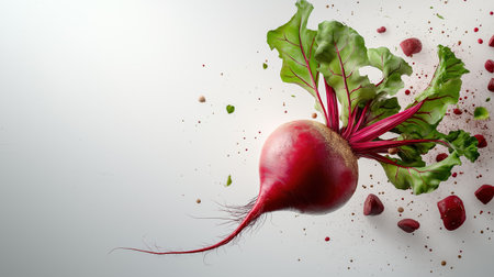 A vibrant beetroot is captured mid-air, displaying its round shape and rich color, while green leaves extend outward.