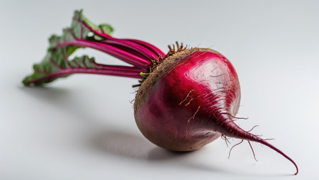 A fresh beetroot rests on a white surface, showcasing its deep red hue and earthy texture. The greens are partially visible, emphasizing its natural state and freshness.