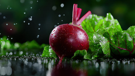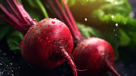 AI Generated. Fresh beets with dew drops on stone slab in garden vibrant colors and natural beauty