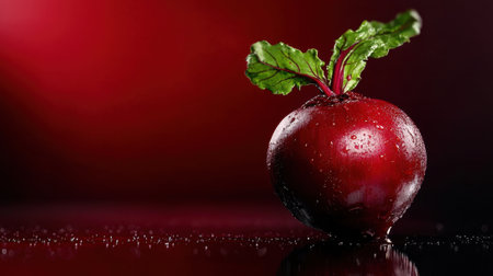 A red beet with a green leaf on top. The image has a mood of freshness and healthiness