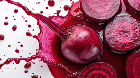 photo of rich red beet juice splash with beetroot slices, high-key lighting, top-down angle, isolated on white background, photography, advertising media --ar 16:9 --style raw --v 6.1 Job ID: 27533d7b-ba2f-44de-aeaa-8e6b9c4e392d