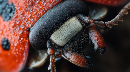 A detailed view of a ladybug with droplets of dew on its vibrant red shell, nestled on a green leaf in a lush garden, captured in the calm of morning.