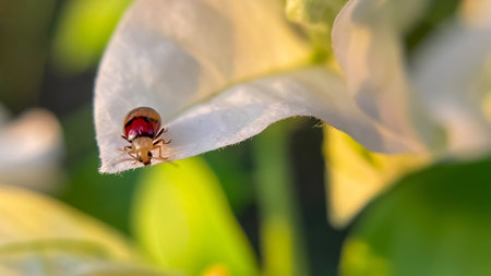 Macro photo of a Monolepta bifasciata beetle on a white bougainvillea flower. Suitable for design and meditative visuals.