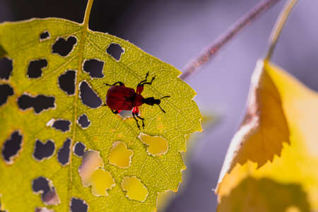Insect feeds on leaves - beetle and holes on an autumn leaf.