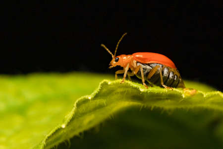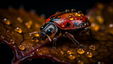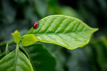 Macro of a red beetle on a green leaf with dew drops