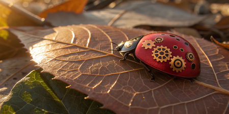 A vibrant, mechanical ladybug crawls delicately over dry autumn leaves. The warm sunlight enhances the intricate design of the insect, creating a striking contrast with the natural background.